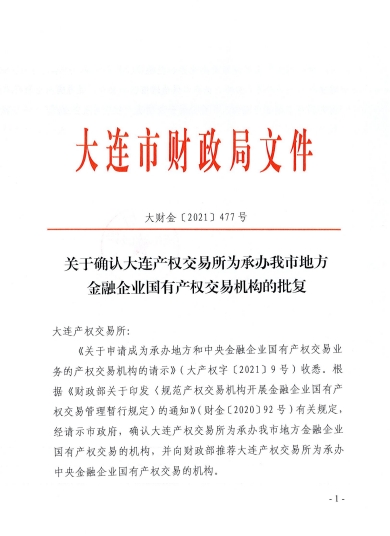 关于确认大连产权交易所为承办我市地方金融企业国有产权交易机构的批复(大财金[2021]477号)