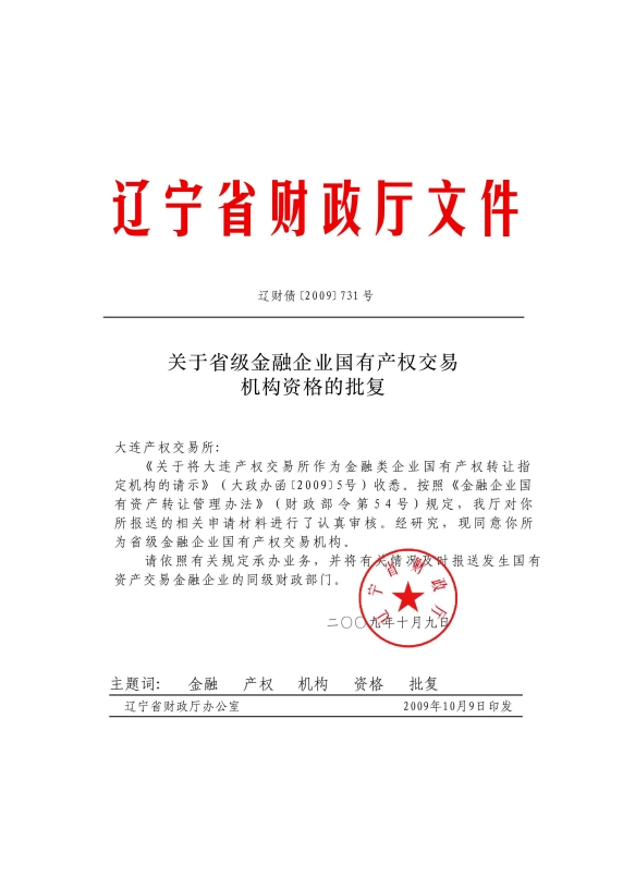 关于省级金融企业国有产权交易机构资格的批复(辽财债[2009]731号)