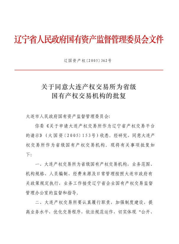 关于同意大连产权交易所为省级国有产权交易机构的批复(辽国资产权[2005]362号)